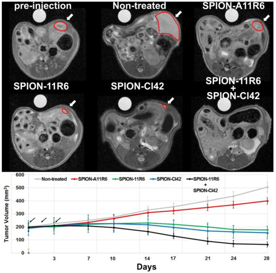 In vivo aptamer-conjugated SPIO nanoparticle therapeutic efficacy assessed using noninvasive MRI. Representative axial MR images (upper row) and corresponding quantitative measurements of tumor volume (lower row) in 4T1 tumor-bearing mice. Noninvasive imaging protocols were performed pre- (t = 0; corresponding to three-weeks post-tumor cell inoculation in the mammary fat pad) and up to 28 days post-injection of three consecutive doses (24 h interval time) of different aptamer therapeutic formulations. Black arrows highlight the injection time points. Pre-injection, non-treated mice, SPION-A11R6, SPION-11R6, SPION-Cl42RNA, and combined SPION-11R6 + SPION-Cl42RNA mice injected groups. White arrows reveal the tumor location and size highlighted with red contours. Data are expressed as mean ± SD, n = 3 per group.