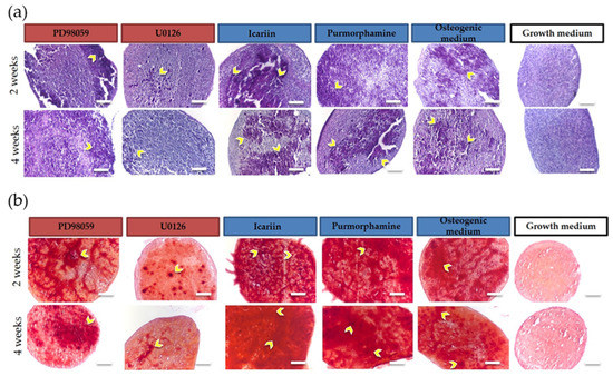Stock solutions of PD98059 (20 mM), U0126 (25 mM), Icariin (10 mM), and Purmorphamine (2 mM) (Sigma Aldrich, St. Louis, MO, USA) were all prepared in anhydrous DMSO (Sigma Aldrich) the day of the experiment. The prepared aliquots were stored at −20 °C until use.
