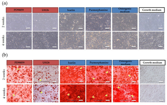 Images before (a) and after (b) Alizarin Red staining of 2D monolayer cultures (n = 3 per medium condition) at two weeks and four weeks in culture. Cells showed non-uniform calcium deposition, displaying zones of accumulation (dark red; indicated by yellow arrows) indicative of osteogenic differentiation (10× magnification, scale bar = 500 µm).