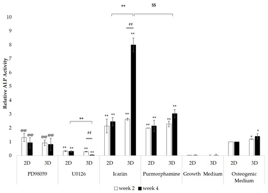 ALP activity was measured in bioprinted constructs (3D) and in monolayer cultures (2D) after two weeks and four weeks in culture. The graph shows fold changes in ALP activity relative to the osteogenic medium control grown in 2D culture conditions. Indicated error bars represent the standard deviation, and significance was determined by one-way ANOVA with Tukey’s multiple comparison test. * p < 0.05 compared to the osteogenic medium control in 2D culture conditions, ** p < 0.01 compared to the osteogenic medium control in 2D culture conditions, ## p < 0.01 between 3D bioprinted constructs at Week 2 and Week 4, ++ p < 0.01 between 3D bioprinted constructs and 2D monolayer cultures at Week 4, $$ p < 0.01 between Icariin and Purmorphamine treated 3D bioprinted constructs at Week 4, @@ p < 0.01 compared to U0126 treated 3D bioprinted constructs and 2D monolayer cultures at Week 2 and Week 4. n = 3 for each treatment.