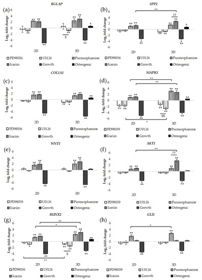 For treated and untreated bioprinted constructs (3D) and monolayer cultures (2D), RT-qPCR was used to determine the expression of osteogenesis associated genes (a) BGLAP, (b) SPP1, (c) COL1A1, (d) MAPK1, (e) WNT1, (f) AKT1, (g) RUNX2, and (h) GLI1 after four weeks of culture. The graph shows the log2 fold changes in gene expression relative to the osteogenic medium control grown in 2D culture conditions. Indicated error bars represent the standard deviation, and significance was determined by one-way ANOVA with Tukey’s multiple comparison test. * p < 0.05 compared to osteogenic medium control in 2D culture conditions, ** p < 0.01 compared to osteogenic medium control in 2D culture conditions, + p < 0.05 between 3D constructs and 2D monolayer cultures, ++ p < 0.01 between 3D constructs and 2D monolayer cultures, ## p < 0.01 between Icariin and Purmorphamine 3D constructs, $ p < 0.05 between U0126 and PD98059 treated 3D constructs, and $$ p < 0.01 between U0126 and PD98059 treated 3D constructs. n = 3 for each treatment.