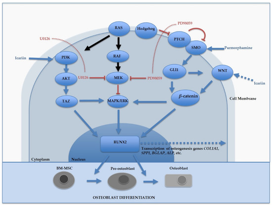 The effect of Icariin, Purmorphamine, U0126, and PD98059 on osteogenic signaling pathways. Icariin activates PI3K/Akt, promoting downstream RUNX2 expression and osteogenic lineage commitment. Purmorphamine stimulates Smoothened (Smo), activating the Hedgehog (Hh) signaling pathway, resulting in the upregulation of its downstream target gene GLI1, as well as the Wnt/β-catenin signaling pathway, leading to bone formation and the promotion of osteogenic lineage commitment. Icariin also regulates osteogenic commitment via the Wnt/β-catenin pathway. U0126 and PD98059 act as MAPK/ERK mitogen activated kinase (MAPK) inhibitors, resulting in inhibition of osteogenic lineage commitment.