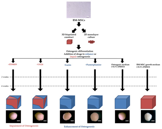As suggested in our previous study [35], our scaffold-free 3D bioprinted in vitro bone model system can potentially be used for studying repairs of osteochondral defects and drug discovery and response. Similarly produced in vitro bone model systems have also evaluated the osteogenic differentiation capacity [36]; however, few studies have examined osteogenic differentiation capacity in comparison to 2D monolayer culture conditions. Furthermore, the potential use of these bone model systems as an in vitro drug screening platform has yet to be evaluated. In this study, we aimed to establish a framework for the development of an in vitro drug screening platform using 3D bioprinted BM-MSCs undergoing osteogenic differentiation to mimic bone. We investigated the effects of administrating drugs known to promote (Purmorphamine and Icariin) or impair (PD98059 and U0126) osteogenic differentiation in both 3D and 2D culture conditions.