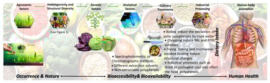 Understanding the intake of polyphenols needed to yield healthy outcomes goes through the deep knowledge of polyphenols nature and food distribution. This creates the first challenge, since the isolation, characterization and structural identification of the major polyphenols in dietary sources is still facing many difficulties. The difficulty to extract completely the polyphenols linked to fiber, the wide variety of chemical and highly complex structures and the different proposed methods of analysis clearly difficult to estimate their real content in foods. Furthermore, polyphenols content in foods depend on several intrinsic and extrinsic factors, such as variety, environmental conditions, agronomic factors, etc. [,]. Moreover, the industrial or culinary processing affect polyphenol content and bioavailability but could also induce structural changes in cell tissues, affecting their interactions with other food components.