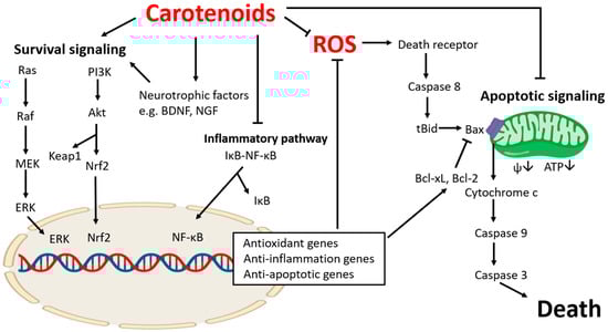 Protective roles of carotenoids during neuronal apoptosis. ROS: reactive oxygen species. ROS can trigger both death receptor- and mitochondria-mediated apoptotic pathways. As an antioxidant, carotenoids scavenge ROS to prevent ROS-induced apoptotic pathways. Carotenoids manipulate numerous cell-signaling pathways including Erk, Akt, and NF-κB to enhance transcription of genes that promote antioxidant defense, anti-inflammation, and anti-apoptosis, illustration done using BioRender.