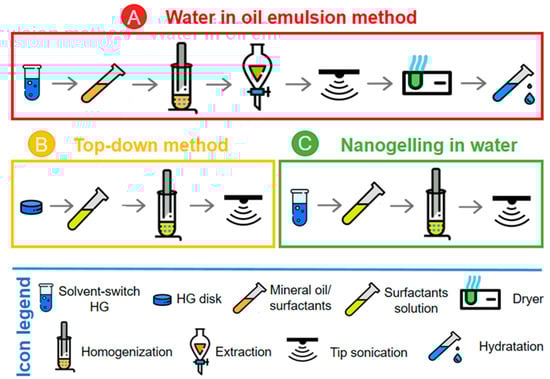 Icons graphical representation of the three different strategies for the nanogel formulation. (A) Water-in-oil emulsion methodology; (B) Top-down method; and (C) Nanogelling in water approach. Each step is identified using an icon of which the legend is reported too.
