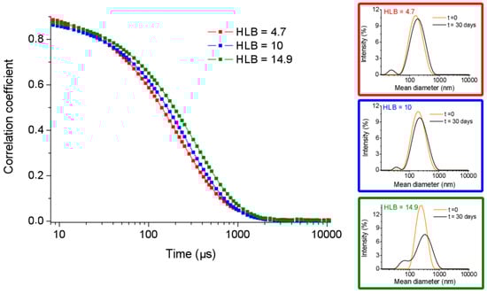 The dimensions of PBNs prepared according the previously procedures at different HLB values and their stability over the time were assessed by dynamic light scattering (DLS). Structural data (mean diameter, polydispersity index, PDI, and zeta potential) for all the samples are collected in Table 1. In Figure 3 are reported the intensity correlation functions for three HLB values (4.7, 10, and 14.9) that represent the two extreme HLB conditions and the middle condition.