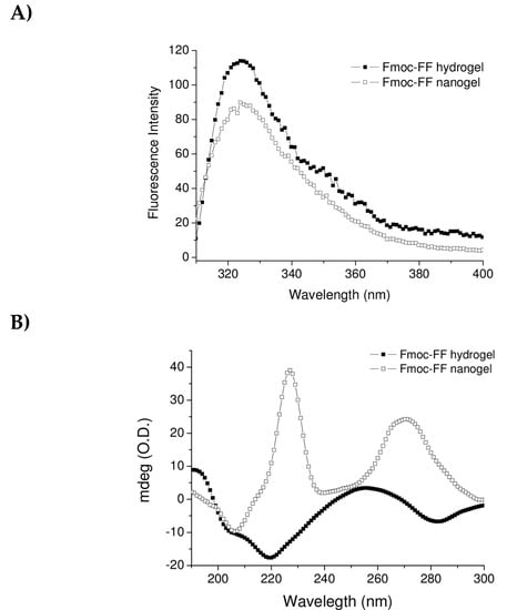 Aggregation properties and secondary structuration of Fmoc-FF-based nanogels were also characterized by fluorescence and circular dichroism (CD) spectroscopies. Because of the structural role of intermolecular aromatic interactions in gelation, fluorescence spectroscopy has been previously employed to understand the molecular organization of Fmoc-FF building blocks in HG formulations [34,35]. It was observed that the fluorescence emission peak λem = 313 nm) of the fluorenyl moiety in its monomeric form could undergo to a red shift in its aggregated form. The wavelength of the fluorenyl moiety, in its associated form, could provide information on the mutual arrangement occurring in the aggregate. A comparison of the fluorescence spectrum of Fmoc-FF nanogel prepared according to the top-down technique with the spectrum of the macroscopic Fmoc-FF hydrogel is reported in Figure 5A.