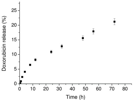 The release profile of doxorubicin from nanogels was studied within 72 h, using a dialysis membrane immersed in phosphate buffer at 37 °C. We assumed that the crossing of the free Dox through the dialysis membrane occurred quickly, thus, the overall release of the free drug from the PBNs to the dialysis bag medium could be considered to be rate determining for the process. The amount of Dox released was evaluated by fluorescence spectroscopy, and the releasing profile is reported in Figure 6, as a percentage of released Dox on the total one previously encapsulated in the nanogel. Doxorubicin release (%) for Fmoc-FF nanogel is around 20% after 72 h, with the most part (~50%) released during the first 8–12 h. This value is significantly lower with respect to the release (80% after 55 h) previously observed by Gazit’s group for Fmoc-FF nanogel prepared using E-TPGS surfactant [19].
