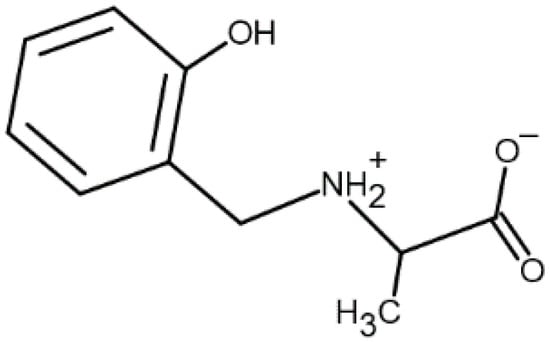 The present study examines the complexation equilibria in the aqueous system of cobalt(II) with the reduced Schiff base N-(2-hydroxybenzyl)alanine, AlaSal (Figure 1), obtained as a result of a reaction between salicylaldehyde and L-alanine, followed by reduction. The formation of specific complex structures is strongly influenced by the nature of the ligands, the pH of the solution, the nature of solvents used, and the concentration of dioxygen in solution [20]. Therefore, in the initial stage of biological research into such compounds, it is necessary to determine the effect of pH on the types of complexes formed, and then their stability in aqueous solution. The evaluation of the antimicrobial properties of AlaSal, as well as of its cobalt(II) complexes present in the system at a pH of about 7 towards several reference bacterial and fungal pathogens was the next step of research. The cytotoxicity of the studied complexes was also examined in order to determine their safety for use for eukaryotic cells.