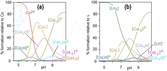 reaches a lower value than the corresponding free ligand deprotonation constant for the phenolic proton (pKa3 = 10.73). Therefore, the metal-promoted deprotonation allows the formation of [CoL] at pH above 5 (Figure 3a). The deprotonations of other protonated complexes [CoL2H]− and [CoL3H]3− are represented by the Equations (2) and (3):
