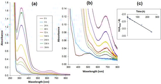The time dependence of the absorbance increasing at 683 nm over 336 h (14 days) of measurements was essentially rectilinear. The obtained results were presented as a logarithmic function: ln(Amax−A) = f(t), where the Amax value is sufficiently estimated on the basis of the absorbance value after 336 h (Figure 4c). The function shows a linear relationship with a determination coefficient of 0.9902, thus confirming a first-order reaction.