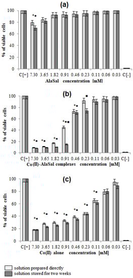 Cytotoxic effect of investigated compounds: (a) AlaSal, (b) Co(II)–AlaSal complexes (c) Co(II) alone towards L929 cells. The cytotoxicity was assessed by MTT [3-(4,5-dimethylthiazol-2-yl)-2,5-diphenyltetrazolium bromide)] reduction assay. The cell viability was calculated for four experiments including three repeats for each compound. Complete RMPI-1640 medium (cRPMI) was used as a positive control (C+) of cell viability (100% viable cells) and 0.03% H2O2 as a negative control (C−) of cell viability (100% dead inactive cells). Statistical significance: *•■ p < 0.05; * untreated cells vs. cells treated with tested solution (solution prepared directly); • untreated cells vs. cells treated with tested solution (solution stored for two weeks) ■ solution prepared directly vs. solution stored for two weeks.