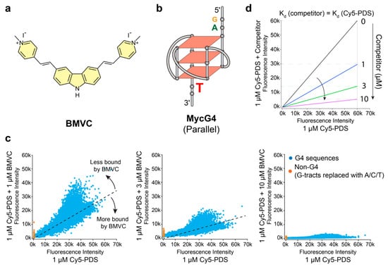 The binding of 3,6-bis(1-Methyl-4-vinylpyridinium) carbazole diiodide (BMVC) to various G4 structures differs from pyridostatin (PDS). (a) Chemical structure of BMVC. (b) MycG4, the major G-quadruplex formed in the MYC promoter NHE III1 in K+ solution, a parallel-stranded G4 structure. (c) Competition experiments of DNA microarrays with thousands of G4 sequences showing the differential binding of BMVC to various G4s as compared to Cy5-fluorophore (λex,max = 647, λem,max = 665) labeled small molecule pyridostatin (Cy5-PDS), as shown by Cy5-PDS fluorescence intensity. The competition experiments were performed in the presence of 1, 3, and 10 µM BMVC. The black dashed lines represent predicted linear relationships when the binding affinities of BMVC and PDS are the same. G4-containing sequences are shown in blue spots. Non-G4 forming sequences are shown in orange spots and serve as negative controls. Each spot represents the average of two independent measurements (Figure S1). (d) Schematic diagram showing the predicted linear relationships when the competitor has the same binding affinities as Cy5-PDS. The competition effects can be revealed by a dose-dependent slope reduction.