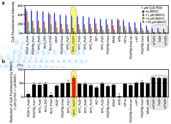 The binding preference of BMVC to known G4 structures. Among the known G4 structures, BMVC prefers to bind to MYC_14/23T, 5′-TGAGGGTGGGTAGGGTGGGTAA-3′ (highlighted by yellow shade). Telomeric sequences are known to form nonparallel structures [42,43,44,45,46] and are poorly bound by Cy5-PDS (shaded in gray). (a) The competition microarray experiments showing dose-dependent inhibitory effects of BMVC on the binding of Cy5-PDS to various known G4 structures. The G4 sequences are shown in Table 1. n = 2 to 20 independent measurements. Error bars represent mean ± SD. (b) BMVC has different inhibitory effects on the binding of Cy5-PDS to the known G4 structures at the equal molar concentration (1 µM). n = 2 to 20 independent measurements. Error bars represent mean ± SD.