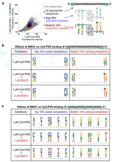 The binding selectivity of BMVC for the flanking sequences of MYC G4. (a) An illustration of binding logo analysis for Cy5-PDS signal with the competition of 1 µM BMVC on MYC G4-derived sequences 5′-NNGGGTGGGGAGGGTGGGNN-3′ (256 total sequences). (b) The inhibitory effects of BMVC on the binding of Cy5-PDS to MYC G4-derived sequences with variant 5′- and 3′- flanking segments (5′-NNGGGTGGGGAGGGTGGGNN-3′). (c) The inhibitory effects of BMVC on the binding of Cy5-PDS to MYC G4-derived sequences 5′-NGGGNGGGNNGGGNGGGN-3′, (4096 total sequences), which include all possible loop and flanking variants.