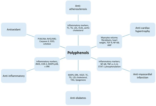 As discussed in this review, polyphenols exert their beneficial effects on treating cardiovascular diseases, including myocardial infarction. They also exhibit antioxidant, anti-inflammatory, anti-cardiac hypertrophy, anti-atherosclerosis, anti-diabetic, and anti-apoptotic activities through modulating various signaling pathways demonstrated in Figure 2.