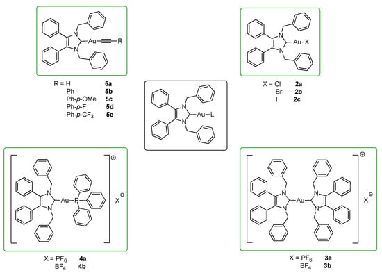 - Collado, A.; Gómez-Suárez, A.; Martin, A.R.; Slawin, A.M.Z.; Nolan, S.P. Straightforward Synthesis of [Au(NHC)X] (NHC = N-Heterocyclic Carbene, X = Cl, Br, I) Complexes. Chem. Commun. 2013, 49, 5541–5543. [Google Scholar] [CrossRef]