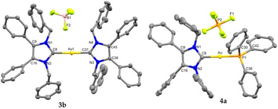 X-ray diffraction structures of [NHC*2Au]BF4 (3b) and [NHC*-Au-PPh3]PF6 (4a); thermal ellipsoids drawn on the 50% probability level. Hydrogen atoms have been omitted for clarity.
