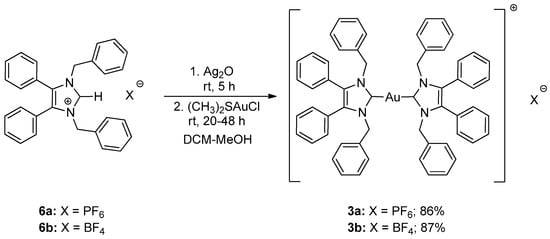 The CH2 moiety of the NHC ligand is a convenient spectroscopic handle to monitor the conjugation of new ligands. In their respective 1H-NMR spectra, the monocarbene halide complexes 2a–2c all show a characteristic CH2 peak at δ = 5.44 ppm. The CH2 peaks appear at δ = 5.23 and 5.39 ppm for the imidazolium salts 6a and 6b, whereas upon coordination to the gold the CH2 peaks shift to δ = 5.19 and 5.21 ppm for biscarbenes 3a and 3b, respectively. Monitoring this region using 1H-NMR spectroscopy during the reaction enabled full conversion of these complexes to be achieved. Additionally, the disappearance of the imidazolium proton from each 1H-NMR spectra indicated coordination to the gold. 19F-NMR and 31P-NMR spectroscopy confirmed the presence of the anion in both the imidazolium and the conjugated biscarbene complexes.