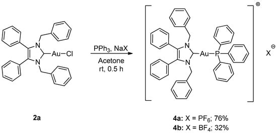 Mixed NHC*-gold(I)-phosphine complexes 4a and 4b were synthesised following an established method []. Complex 2a was reacted with triphenylphosphine and either NaPF6 or NaBF4 (Scheme 3). Ligand scrambling was observed with longer reaction times and degradation to [NHC*2Au]+ and PPh3-Au-Cl was noted. 1H-NMR spectroscopy confirmed the conjugation of the phosphine ligand as additional peaks were reported in the aromatic region alongside the appearance of two new peaks in the 31P-NMR spectra.