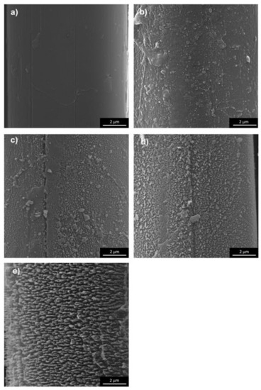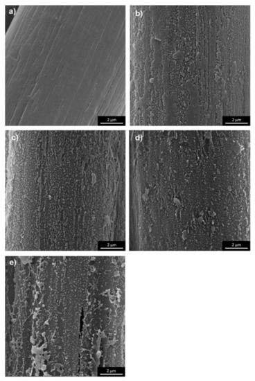 SEM images of the fiber surface of: (a) reference, (b) 10 min, (c) 30 min, (d) 60 min, (e) 90 min plasma-treated meta-aramid (mAr) yarn (magnification 20000×).