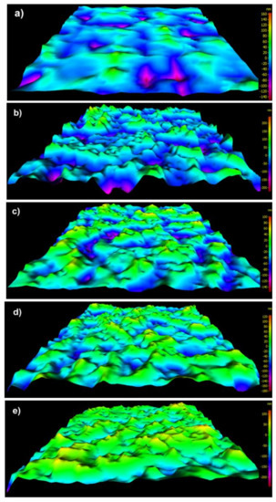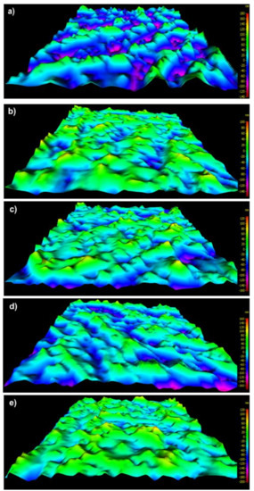 The values of Sa, Sv, and Sz of pAr/0 yarn are 23 nm, 152 nm, and 317 nm, respectively (Figure 4a). Longitudinal cracks on the surface are deeper than for mAr/0. The Sdr for pAr/0 is 12% and is 30% lower compared to mAr/0. After 10 min of activation, there was an increase in Sa value of about 26% compared to pAr/0 (Figure 4b). After 30 and 60 min (Figure 4c–d), the Sa value does not change further, but after 90 min decreases by 10% compared to pAr/60 (Figure 4e). The value of Sv after 10 and 30 min of activation is lower by 10% and 5%, respectively, and after 60 and 90 min is higher by 30% and 60%, respectively, in relation to pAr/0. The Sz value after 10 min and 30 min activation is lower by 12% and 18%, respectively, compared to pAr/0. After 60 min, an increase in Sz value by about 18% was recorded, relative to pAr/30. The highest value of Sz is observed after 90 min of activation and it is 364 nm. The Sdr increases by approximately 133%, 116%, and 141% for pAr/10, pAr/30, and pAr/60 yarns, respectively, compared to pAr/0. For pAr/90, the Sdr value decreases by 28% compared to pAr/60.