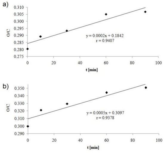 Figure 5 shows the effect of activation time on changes in O/C ratio on the fiber surface. For both yarns, the O/C value increases linearly as the activation time increases, but they are higher for pAr yarns.For 90 min, the increase in the O/C ratio is 10% and 17% for mAr yarn and pAr, respectively. An increase in O/C was also observed in the earlier work of the authors after corona discharge modification of the meta- and para-aramid fabric [15].