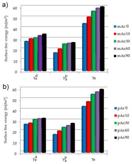 Table 3 summarizes the values of contact angle for yarns before and after activation in plasma for water (θW), θformamide (θF) and diiodomethane (θDIM). The values of θW, θF, and θDIM decrease with the increase of activation time. The value of θW form Ar/0 is 65.4 deg. For subsequent activation times it decreases by 16%, 30%, 35% after 10, 30 and 60 min, respectively. For mAr/90, the θW value stays at the same level as for mAr/60. The value of θF decreases by 4%, 17%, 24%, and 36% compared to 53.9 deg for mAr/0. The value of θDIM decreases by 16%, 20%, 30% after 10, 30, and 60 min compared to 60.2 deg for mAr/0. For mAr/90, the θDIM value does not change in comparison with mAr/60.