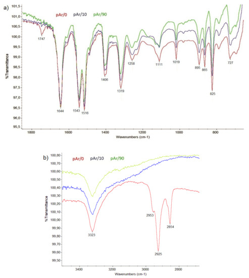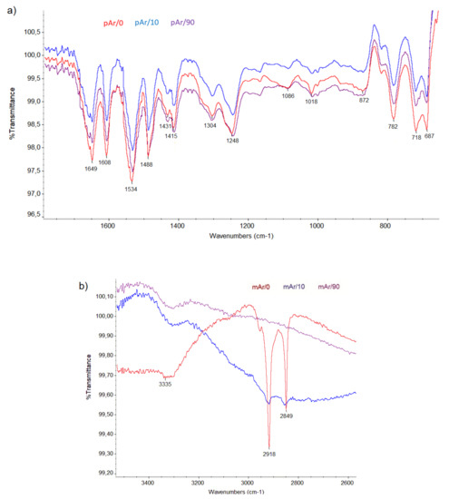 In the spectra for both yarns (Figure 7, Figure 8), a double band at 2849 and 2918 cm−1 for mAr/0 and 2854 and 2925 cm−1 for pAr/0 is observed. These bands indicate the presence of alkyl chain what indicate the presence of finishing agent on the surface of the fibers. For pAr also carbonyl bound (1748 cm−1) is present as a structural fragment of mention finishing agents that are removed during plasma treatment during the first 10 min of activation. Because changes in surface topography can be observed without their influence on the FTIR spectrum, in this situation it can be concluded that during plasma treatment, aramids break down into low molecular weight fragments that are removed from the surface of the fibers. Low pressure in the plasma chamber favors the removal process of small molecular weight products of fibers surface etching.