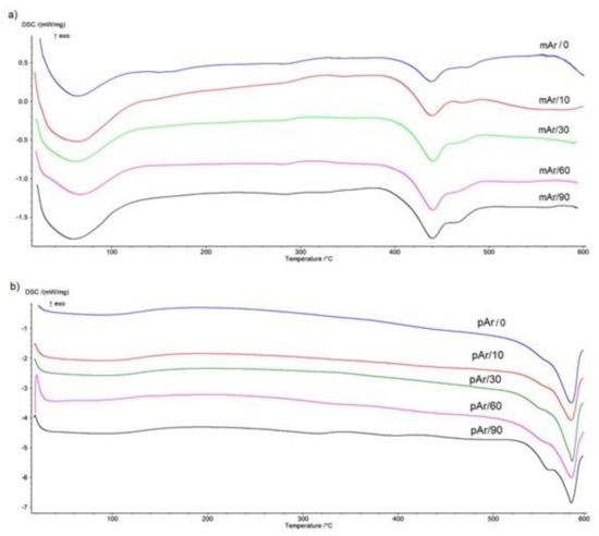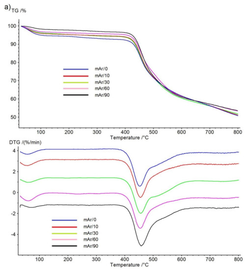 On the DSC curve for the mAr/0 (Figure 9a), there is an endothermic peak in the range 20–120 °C, which indicates water desorption. The degradation process occurs in two stages in the range of 406–491 °C, with maximaof endothermic peaks at 439 °C (first stage) and 478 °C (second stage), and the heat of thermal decomposition is 95 J/g (Table 5). As the activation time increases, the initial temperature of thermal degradation increases by 4 °C, 6 °C, 8 °C, and 12 °C, for mAr/10, mAr/30, mAr/60 and mAr/90, respectively. The final and in the peak 1 maximum temperature does not change significantly, and the temperature in peak 2 maximum decreases with an increase of activation time by 4 °C, 6 °C, 10 °C, and 12 °C, respectively. The heat of thermal decomposition increases by 6%, 11%, 22%, and 50%, respectively.
