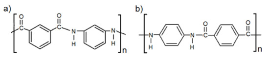 Chemical formulas of: (a) meta-, (b) para-aramid yarn.