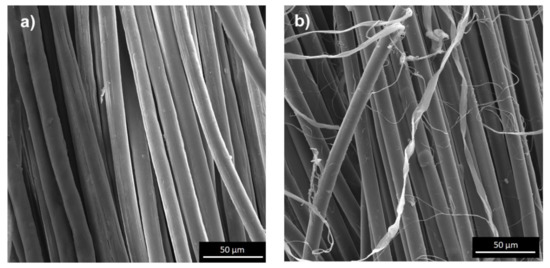 It can be seen that there is a clear difference in the surface morphology of unmodified yarns and both types of aramid fibers after plasma treatment. On the relatively smooth surface covered with longitudinal cavities and microfibrils, no protruding fragments are visible. Still, on the rough surface of aramid fibers after activation, numerous cavities, and fiber fragments are resulting from plasma etching. Plasma treatment causes the polymer degradation due to ion, electron, and free radical bombardment. The results of surface roughness analysis are shown in Figure 2 and Figure 4. The trends of surface roughness changes were in line with the trends visible on the SEM and 3D SEM images. As the plasma treatment time increased, more and larger fragments were evenly distributed over a much rougher surface. When the plasma treatment time increased to 90 min, the surface roughness of both types of aramid decreased, which can be attributed to the continuous etching or ablation process.