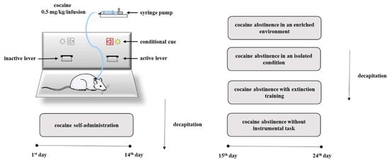Following the food training period, rats began the self-administration procedures using the same standard operant chambers. The criterion for cocaine self-administration was a minimum of ten infusions per day (0.5 mg/kg/infusion, 2 h/day) for 14 days. Active lever presses during cocaine self-administration resulted in delivery of a dose of cocaine, as well as the simultaneous stimuli of light illumination (24-V) above the active lever and a tone presentation (2000 Hz; 15 dB) for a programmed duration of 5 s. A 20-s timeout followed the delivery of each infusion during which time active lever presses were recorded but had no consequences. Presses on the inactive lever were recorded, but not reinforced. Acquisition of the conditioned operant response lasted a minimum of 5 days until subjects met a stable average for three consecutive days and a standard deviation within those days of <10% of the average [46]. After the 14th (2-h) self-administration session, a subset of the above cohort (N = 6 rats/group) was decapitated. The remaining cohort trained to self-administer cocaine (0.5 mg/kg/infusion) for 14 days was exposed to the four abstinence procedures (see Section 4.7.). The experimental protocol steps are presented in Figure 1.