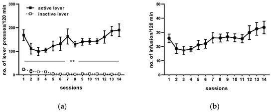 Maintenance of cocaine (0.5 mg/kg/infusion) self-administration (representative graph). All data are expressed as means ± SEM. N = 6 rats/group. ** p < 0.01 vs. inactive lever. (a), numbers of active and inactive lever presses; (b), numbers of cocaine infusions.