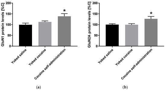 Changes in the expression of NMDA receptor subunits (GluN1, GluN2A and GluN2B) in the nucleus accumbens in rats following cocaine self-administration. All data are expressed as % of control (mean ± SEM). N = 6 rats/group. * p < 0.05 vs. yoked saline. (a), GluN1 protein levels [% of control]; (b), GluN2A protein levels [% of control].; (c), GluN2B protein levels [% of control].