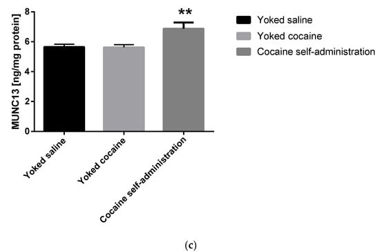 An increase in the Munc13 (F(2, 15) = 6.478; p = 0.009) and RIM1 (F(2, 15) = 4.294; p = 0.034) level was shown in rats self-administering cocaine in the nucleus accumbens (Figure 4).