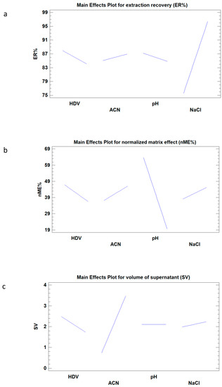 In the ANOVA table, p-value less than 0.05 indicate the statistical significance of an effect at 95% confidence level. Furthermore, as can be clearly seen, the recovered volume of the extraction solvent (ACN) was influenced by both solvent extraction volume and honey dilution volume (p-value < 0.05) while ER and nME were statistically influenced by pH and NaCl percentage of honey-diluted solution, respectively. Regarding the interaction among the four variables, no significant interactions were found (p-value > 0.05). Therefore, their p-values were not reported in the Table 1. The main effects’ plot (Figure 1) shows that the slope of the line is proportional to the size of the effect and that the direction of the line has a positive or negative influence of each effect on each variable. As shown in the main effect plot of ER (Figure 1a), the NaCl percentage in honey solution linearly increases the recovery of CAP, while the other three effects play a slight influence on the variable. The main effect plot of nME (Figure 1b) shows that pH has a strong influence because the suppression of CAP electro spray ionization source increases when acidic or neutral pH values were reached. This behavior may be attributed to the presence of ionizable interferences into the matrix, which could be extracted in a larger amount at low pH values. As a confirmation, after the evaporation of the extraction solvent deriving from the analysis of samples at low pH values (<7), a clearly visible yellow residue was observed. As far as the recovered SV is concerned (Figure 1c), a linear increase was observed when the ACN volume was increased, while a low amount of supernatant volume was obtained when HDV was increased.