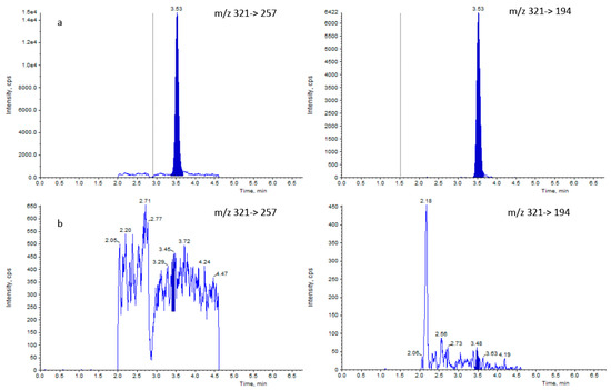 In addition, the analysis of the 20 blank samples allowed us to calculate the average (µN) and the standard deviation (σN) of the noise of the signal amplitude, which were used in the CCα and CCβ determination. The calculated values were µN of 235.2 and σN of 1902.0 for precursor/product 321→257, while µN of 165.3 and σN of 86.1 for precursor/product 321→194.