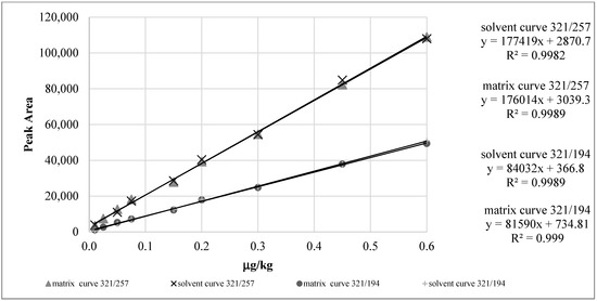 Comparison between calibration curve in solvent and in matrix at the same concentration range for 321→257 and 321→194 ion transitions.