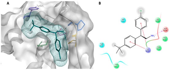 Figure 10 illustrates the predicted docking mode of compound 5f which offers the advantage of lacking the chiral centre present in compound I. Compound 5f sits in the pocket surrounded by residues Ser 910, Thr 925, Thr 929, Pro 911, Pro 913, Lys 1032, and Asp 1036, as shown in Figure 5. Key interactions of compound 5f due to the presence of the free amine (NH2) group include a salt bridge with the side chain carboxyl group (COOH) of Asp 1036, two H-bonds with the backbone carbonyl (C=O) group of Pro 911, and the side chain hydroxy group (OH) of Ser 910. In addition, hydrophobic interactions were noticed between the p-tert butyl phenyl moiety and the surrounding hydrophobic pocket formed of residues Tyr 925, Val 928, Val 932, Pro 913, and Leu 1035 (Figure 10).