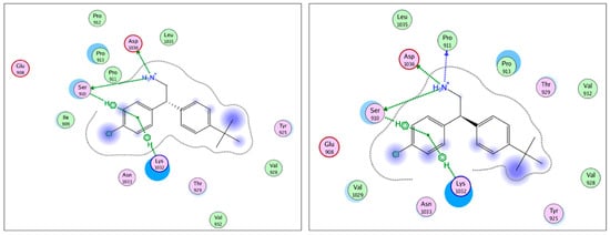 According to the surface representation of the FAK-FAT domain, the predicted docking mode of compound I binds in a comparatively polar cavity surrounded by residues Ser 910, Thr 929, Pro 911, Pro 913, Lys 1032, and Asp 1036, as shown in Figure 3. Key interactions of compound I due to the presence of the free amine (NH2) group include a salt bridge with the side chain carboxyl group (COOH) of Asp 1036, two H-bonds with the backbone carbonyl (C=O) group of Pro 911, and the side chain hydroxy group (OH) of Ser 910. Additionally, hydrophobic interactions were noticed between the p-tert-butyl phenyl and p-chlorophenyl moieties and the surrounding hydrophobic pocket formed of residues Tyr 925, Val 928, Val 932, Pro 913, and Leu 1035 (Figure 3). Compound I possesses a chiral centre and both isomers are accommodated at the binding site and bind similarly with minimal difference in binding potential between enantiomers (Figure 4).