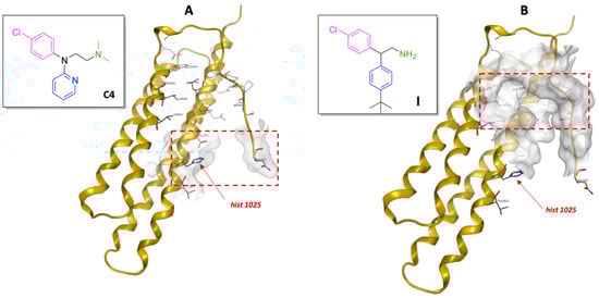 Comparison between the site selection (red dashed box) for the high throughout virtual screening of the drug-like FAK-FAT inhibitor; (A) previously identified chloropyramine (C4) centred around His 1025. (B) Our virtual screening hit compound I centred around the Asp 1036, Ser 910, and Lys 1032 pocket.
