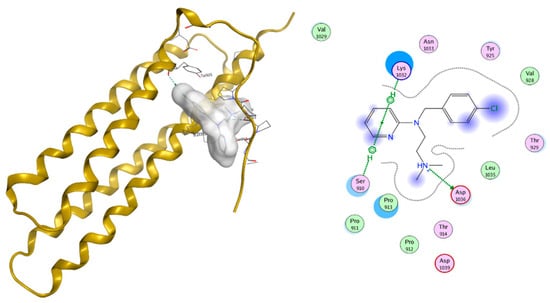 The predicted binding mode of chloropyramine (C4) showing detailed interactions with the pocket of the FAK-FAT domain; hydrogen bond is indicated by the dashed lines.