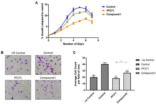 (A) Relative 7-day proliferation of MDA-MB-231 cells in vitro in the presence of 1 μM compound I or PF271 compared to vehicle-only control. (B) Representative images of Boyden chamber migration assays incubated with compound I or PF271, post 18 h serum-stimulated migration. (C) Quantified results of anti-migratory effects of compound I and PF271 from 18 h Boyden chamber migration assay. Negative (-ve) control represents non-serum stimulated cell migration. Data represent the average number of cells/membrane across duplicate wells and 3 replicates. Error bars show SEM: *p < 0.05; ***p < 0.001.