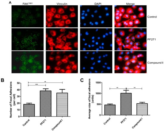 Exploration of subcellular dynamic changes in active FAK and FA-marker vinculin following compound I or PF271 treatment. (A) Images are representative of MDA-MB-231 cells following 1 h of serum stimulated migration in the presence of compound I, PF271, or a vehicle-only control. The generated images were subsequently used to quantify changes in the average number of focal adhesions/cell (B) and the average size of focal adhesions (C). All error bars represent SEM; n = 3. **p < 0.01; ***p < 0.001.