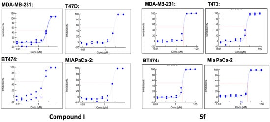 Antiproliferative activity of compounds I and 5f across three human breast cancer cell lines (MDA-MB-231, BT474, and T47D) and one pancreatic cancer (Mia PaCa-2) cell line.