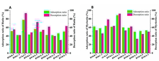 Adsorption/desorption ratios for rutin (A) and myricetin (B) on ten resins.