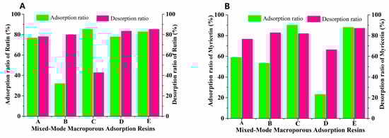 Adsorption/desorption ratios of rutin (A) and myricetin (B) on five different ratio resins (A–E: AUKJ-1 and BWKX-1 in 1:1, 1:1.5, 1.5:1, 1:2, 2:1 in turn).