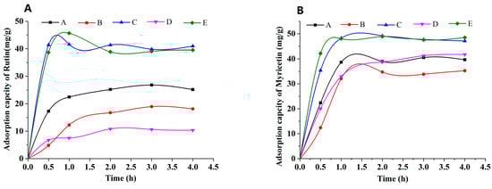 Adsorption capacity of rutin (A) and myricetin (B) on mixed-mode MARs (A–E: AUKJ-1 and BWKX-1 in 1:1, 1:1.5, 1.5:1, 1:2, 2:1 in turn).